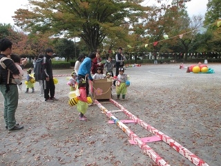今年は牛乳パックで作った線路の上をはち、あり、トンボのチームに分かれて電車ごっこ。