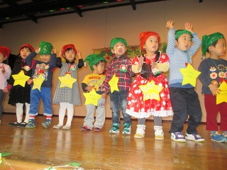 今週1週間は未就園児から小学生までクリスマス週間。未就園児はママと一緒にゲームや体操リトミックなど、みんな一緒に楽しみました。サンタさん登場。初体面に大泣きするお友達もいましたが目を丸くしてサンタさんと握手・・。元気いっぱい過ごしました。楽しい思い出ができましたね。