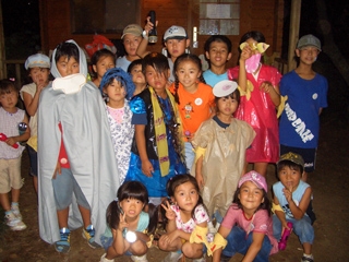 今年のキャンプは10,11日に清水公園で行いました。何と言っても今までで一番と言えるほど暑い2日間でした。グループに分かれてお化けラリー・花火・すいか割り・探検ビンゴと盛りだくさんのリクレーションで楽しんできました。昨年まではお姉さん達に面倒を見てもらっていたお友達が今年は逆に優しく面倒を見てあげたりと一人ずつの成長を感じたキャンプでした。トマトの卒業生3人の高校生がお手伝いをたくさんしてくれて大助かりでした。卒業しても触れ合う事のできるキャンプはやっぱり貴重な時間です。写真はグループ対抗でゲゲゲの鬼太郎に変身し競い合った時のものです。みんなで協力して変身しましたよ。なかなか寝付けなくてずっとおきていたお友達もいましたが次の日まで元気いっぱいでした。楽しい夏の思い出となりました!!