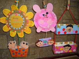 毎年、敬老の日には未園児就から小学生まで父方、母方のおじいちゃまおばあちゃまにカードを送っています。手形・足型・自由画などクラスごとに内容は違いますが一年に一度祖父母に送るカードです。「運動会見に来てね!」「腰に気をつけてね。」など労わる言葉も書かれていました。一枚一枚に心を込めて小さな手で作りました。エネルギーが沸いてくるカードです。また来年もお孫さん達の成長を楽しみにしていてくださいね!