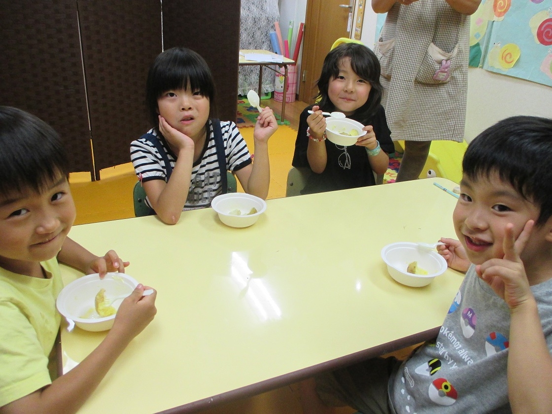毎日暑いですね~もうすぐ1学期も終わりです。新しい環境にも慣れた子供たちです。幼稚園児小学生は夏休みの補習などもあります。宿題なども見直しつつ進めます。新しいクラスにも慣れてみんなお友達になってますよ。未就園児さんが掘ったじゃがいもも皆で食べてます。