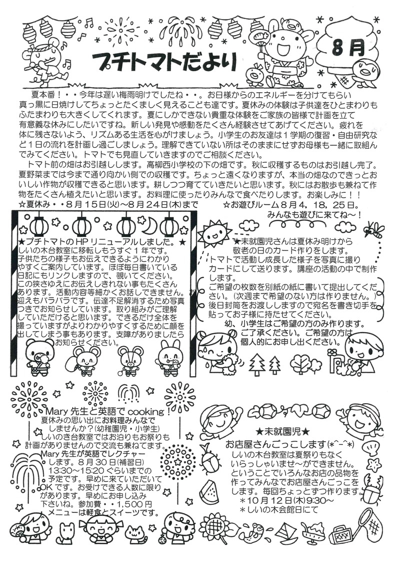 子供たちの夏休みに入り羽を伸ばしているようです。8月は補習、夏の遊びとトマトは1回をのぞいて通常になります。元気にきてくださいね。夏風邪も流行ってきたようですのできをつけてください。